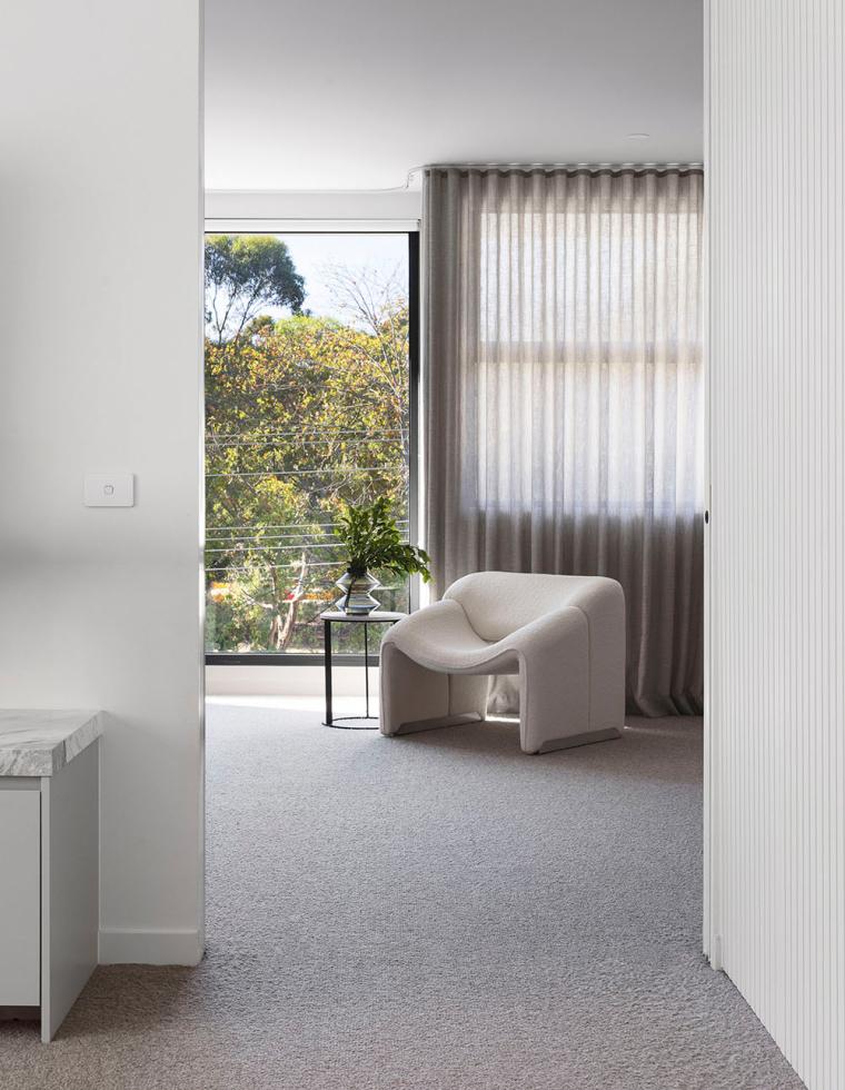 Upstairs, a striking light-filled void opens into a spacious retreat. Timber batten cladding adds texture, seamlessly connecting the master wing with the kids’ rooms. Positioned at the front of the home, the master suite features large windows that capture the lush green view of the parkland across the street. The gorgeous walk-in robe and ensuite, with beautifully integrated joinery and luxurious floor to ceiling stone tiles, enhance the hotel's inspired elegance of the space.