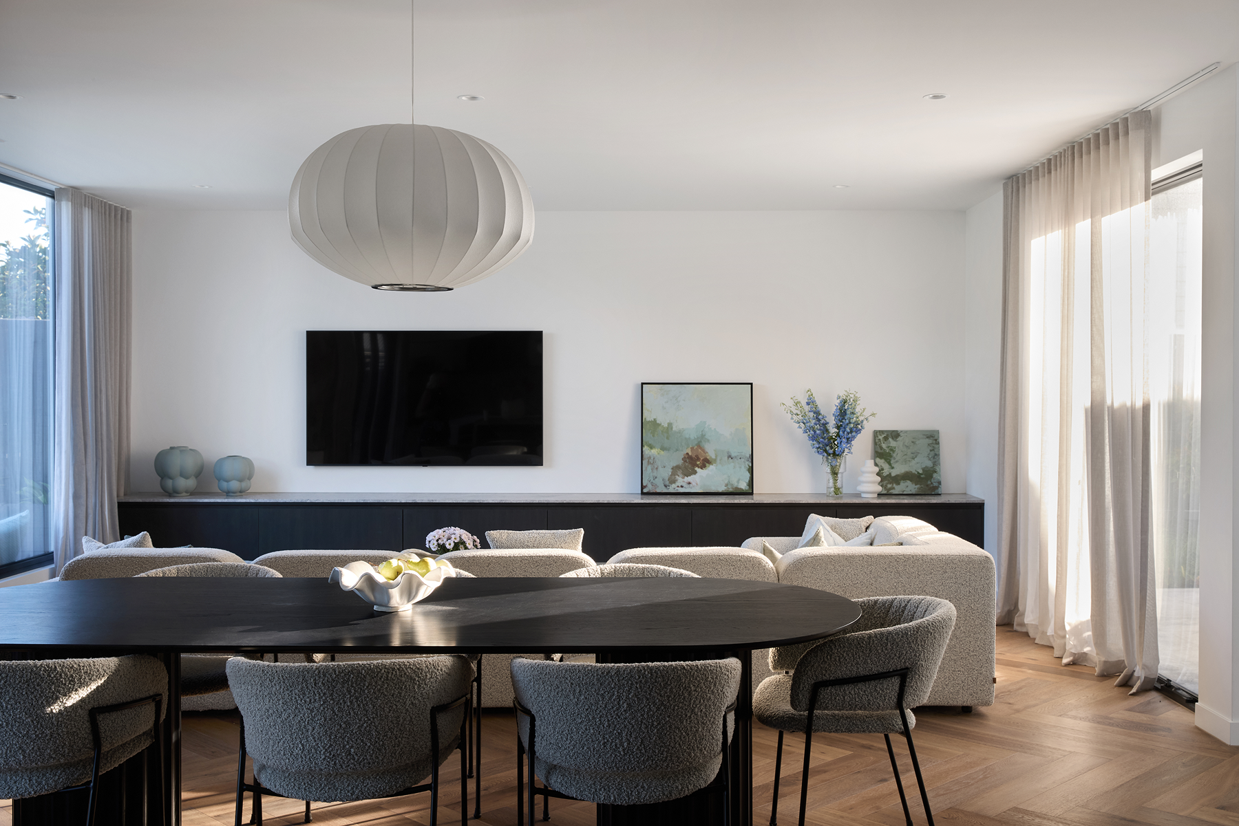 At its heart, a spacious open-plan kitchen, living and dining area is appointed with a monochromatic colour palette featuring exquisite grey Tundra stone benchtops and a large island bench, reflecting the client’s love of cooking and hosting. A generously sized butler’s pantry ensures that function meets aesthetics, allowing for seamless preparation while keeping the main space pristine. A key feature of the layout is an integrated bar, perfectly situated just off the dining area, framed by a subtle archway that softens the strong architectural lines around it, creating a seamless blend of structure and warmth.