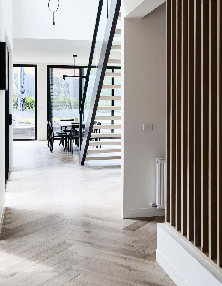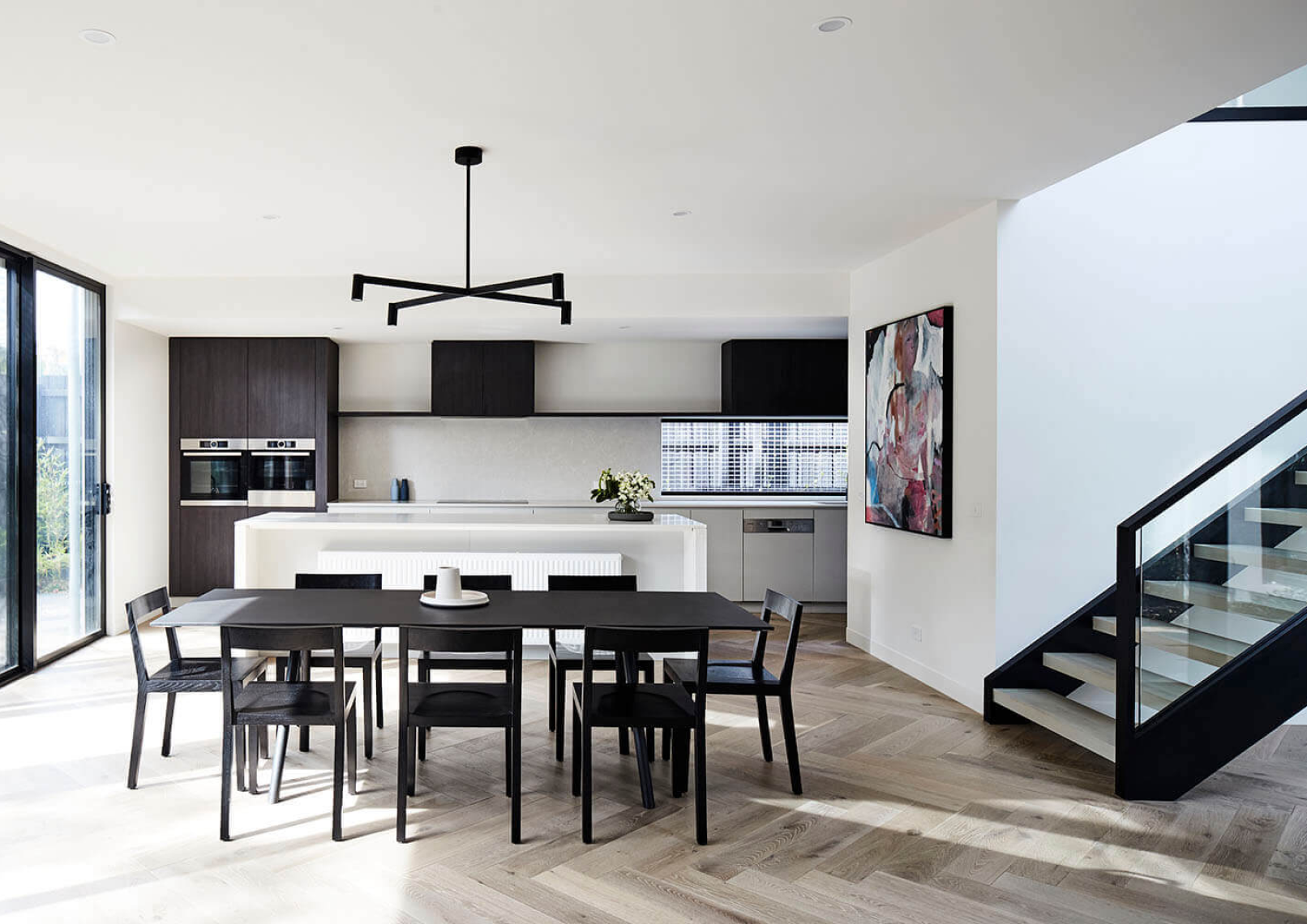 The raised entry set out in herringbone engineered flooring spanning the entire ground floor of the home, then steps down enticing visitors to a quiet formal lounge at the front of the home overlooking the tree lined street with large full height windows. A specific floor plan layout was the result of locating the family living zones to the rear of the home to maximise the sunny aspect of the rear yard. Resulting in an enormous rear living zone with an abundance of expansive full height windows and large stacking doors opening onto outdoor multiple entertaining spaces.