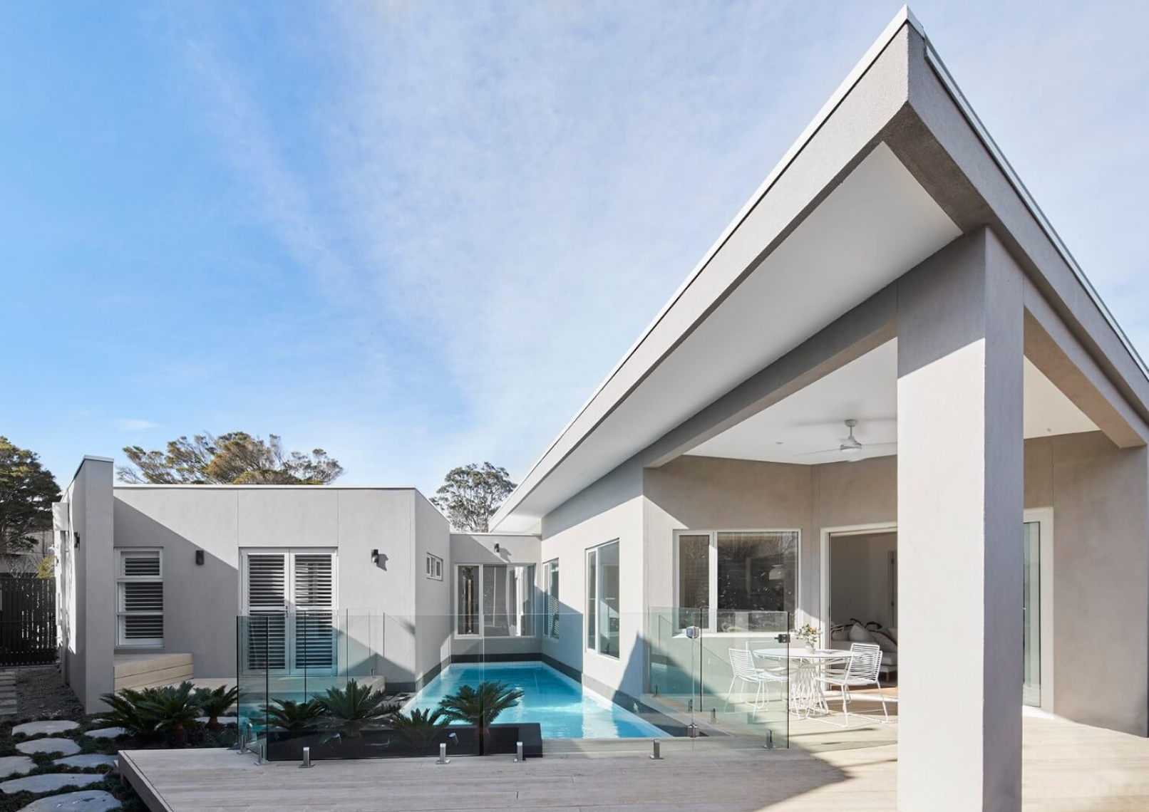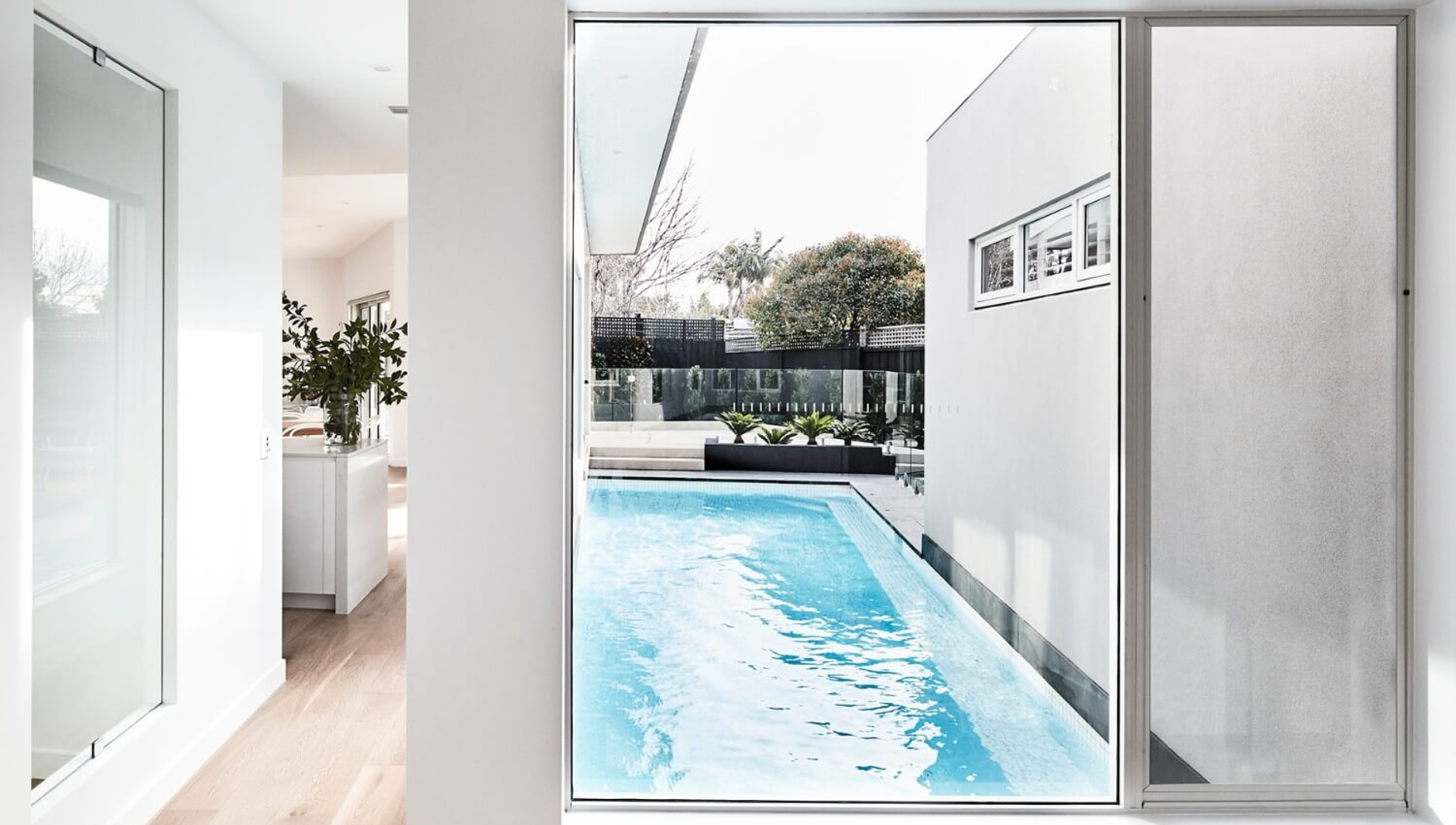 A cleverly zoned floor layout is achieved with the utilisation of a swimming pool as a splice through the house that separates the Master suite wing from the main living areas, creating a visual feature enjoyed from everywhere in the home through expansive glazing sections.