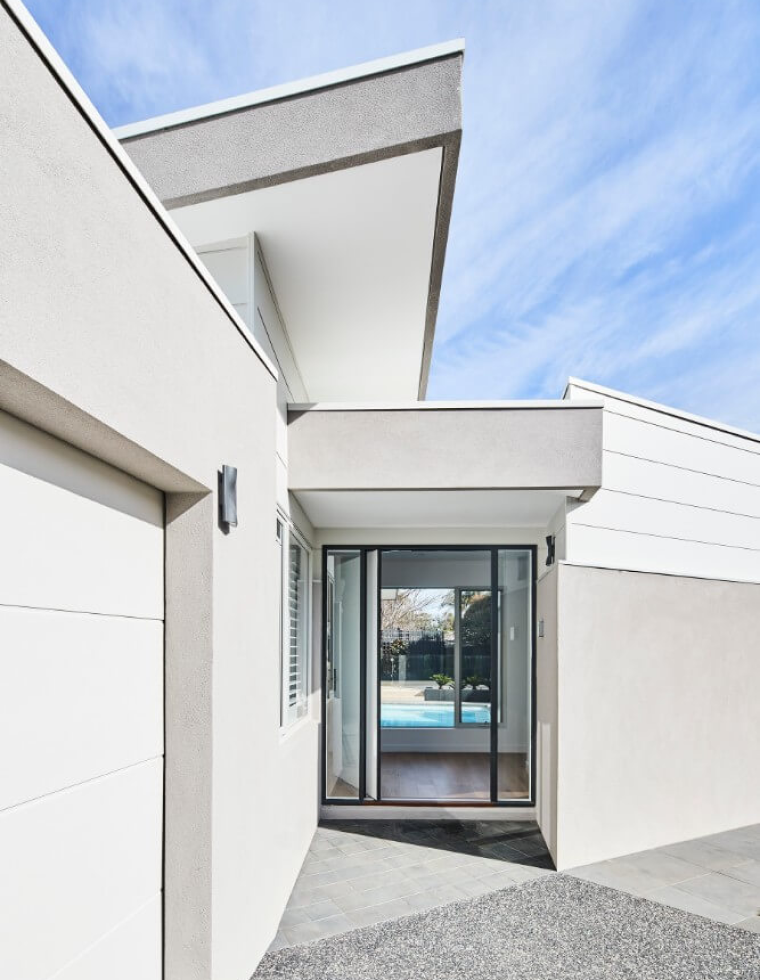 An irregular shaped site inspired the direction for this uniquely designed single storey modern residence.