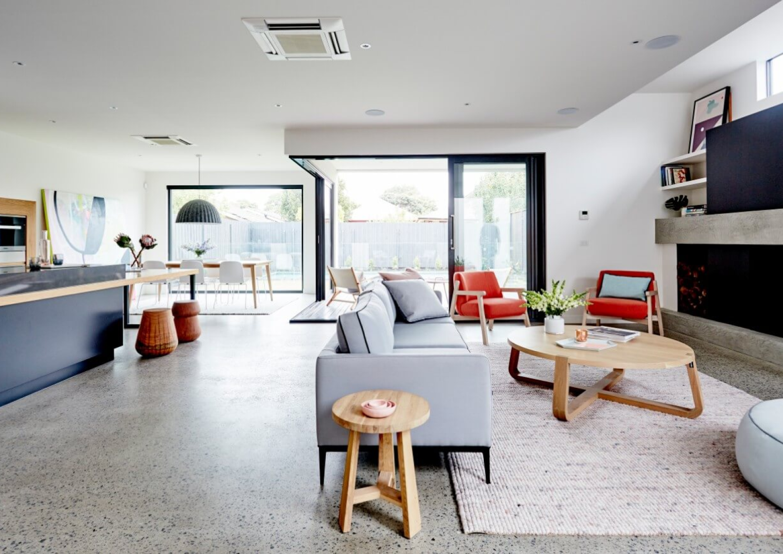 This contemporary home is the culmination of an innovative design approach and the clever utilisation of space and light. The proposed site presented numerous challenges being on an infill block barely just over 12 metres in width, in one of Melbourne’s most progressive inner suburbs and sandwiched between 2 older established homes. A clever design approach was required to achieve the client’s brief of an expansive and open-planned modern family home whilst allowing a visually interesting street presence that would also harmoniously blend into the changing neighbourhood character. An unconventional entry was chosen to be located down the side of the home, allowing the accommodation requirements to entirely span across the frontage. The side entry also creates a more interesting approach up to and through the front door as you pass through the landscaped and timber beam portal structure, arriving into the light-filled foyer with views through an expansive picture window overlooking a fishpond.