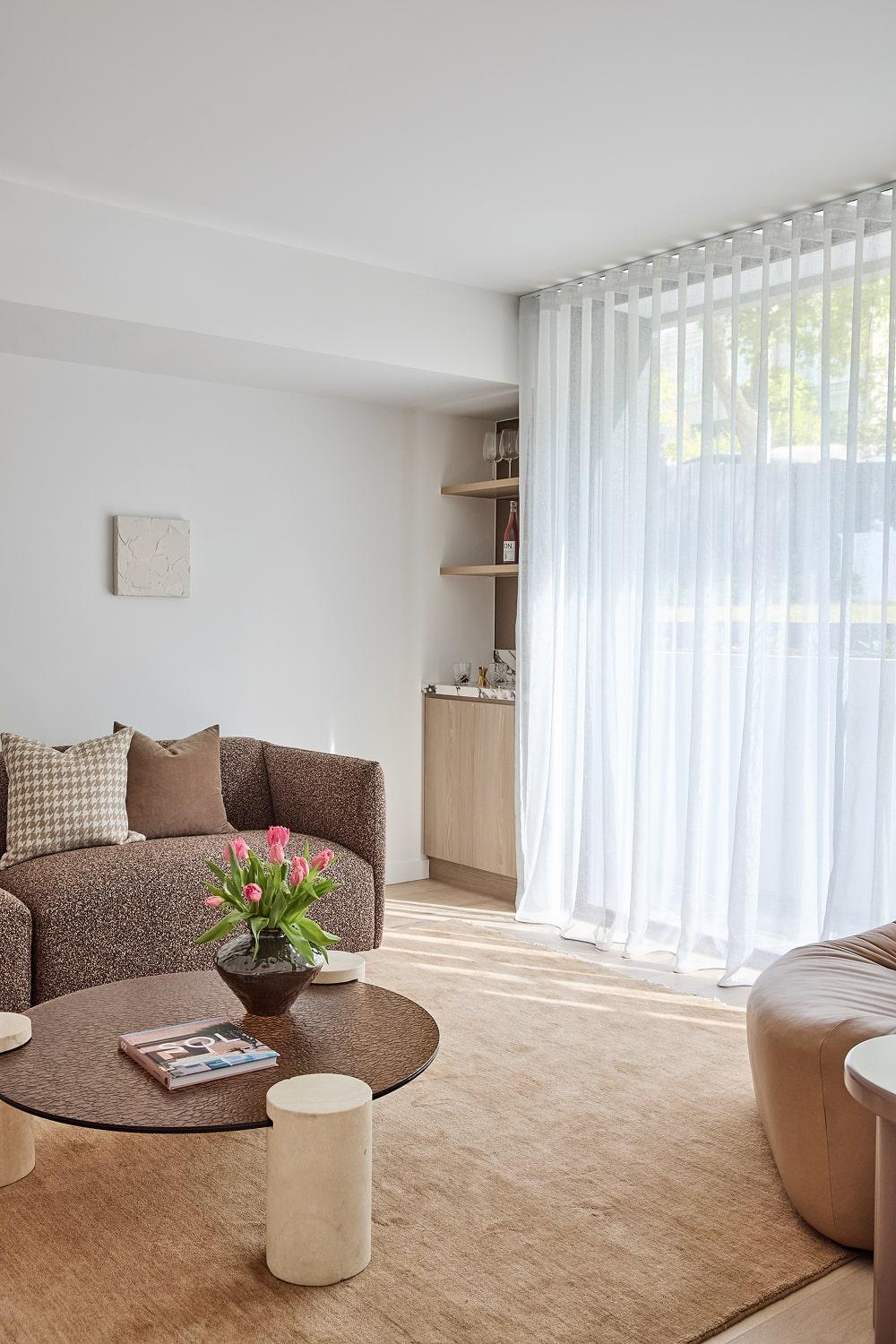 Down from the main living areas, the sunken living room forms a natural retreat. Anchored by a feature fireplace with bold stone joinery, the space introduces warmth and intimacy, offering a refined counterpoint to the openness of the surrounding zones.