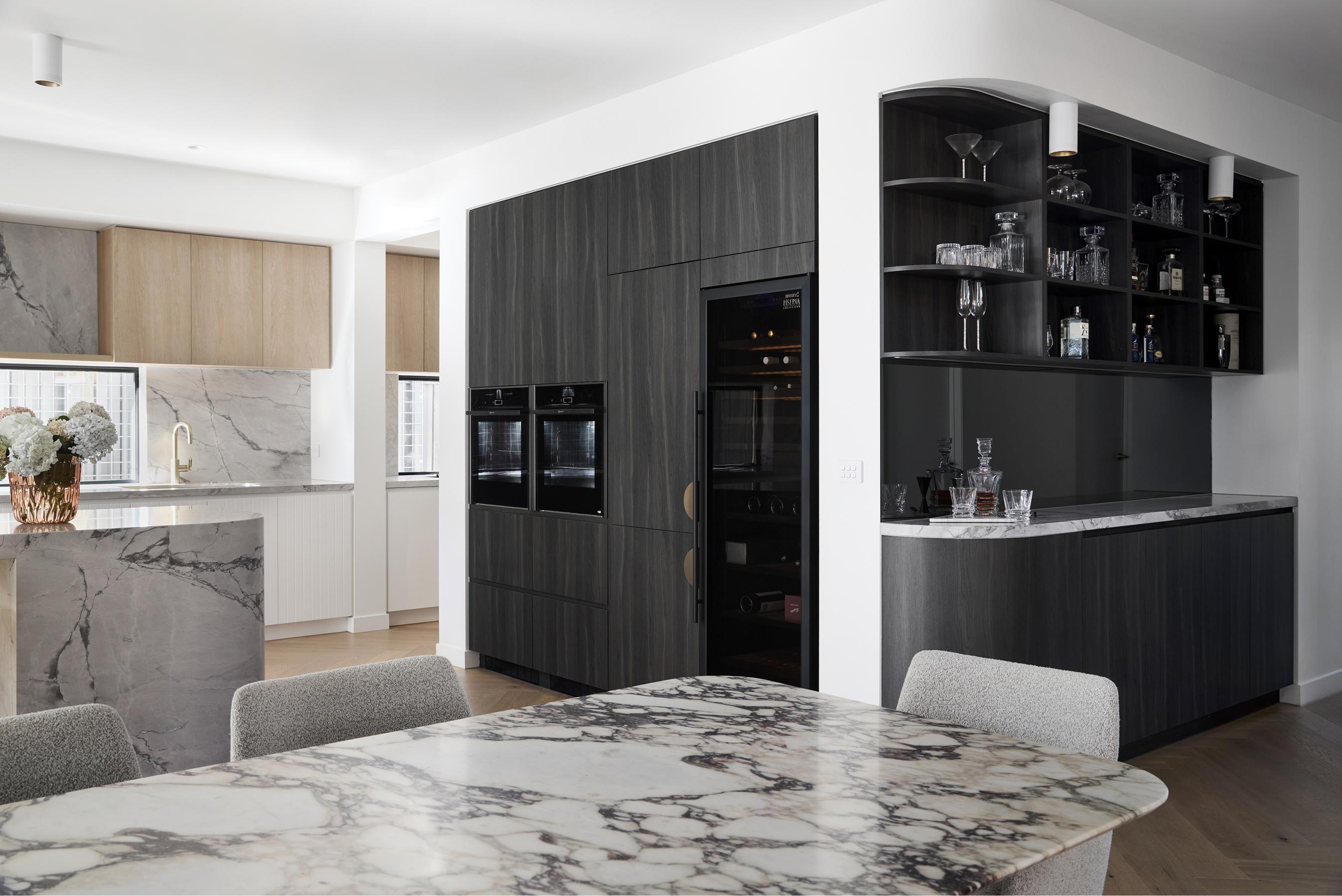 The open-plan kitchen is a centrepiece of calm luxury. A curved island bench with super white natural stone benchtops anchors the space with its organic form balancing the architectural edges. Timber joinery introduces warmth and contrast, while a discreet butler’s pantry enhances the space for convenience. The palette continues upstairs, reinforcing design continuity and quiet cohesion.