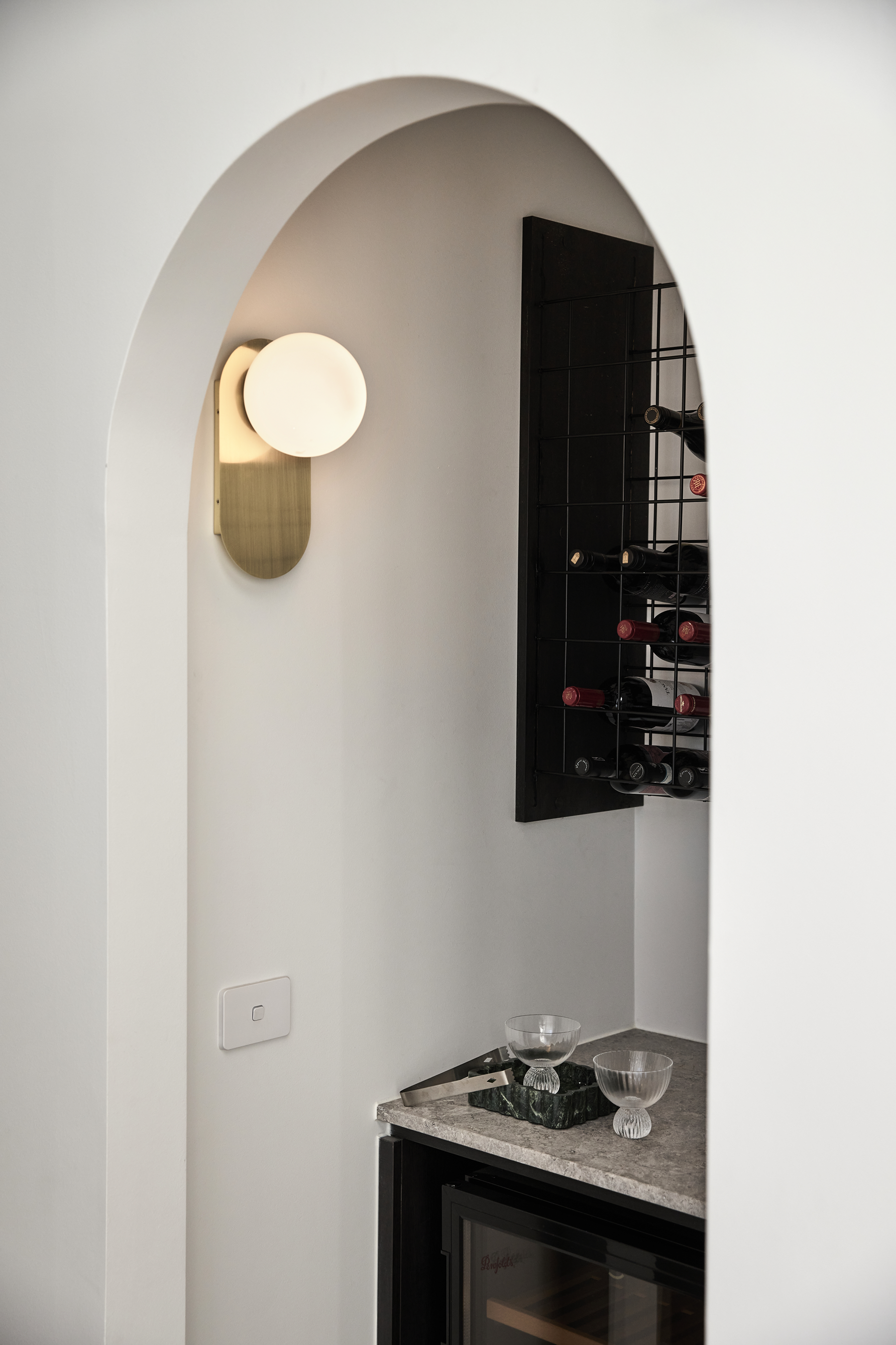 At its heart, a spacious open-plan kitchen, living and dining area is appointed with a monochromatic colour palette featuring exquisite grey Tundra stone benchtops and a large island bench, reflecting the client’s love of cooking and hosting. A generously sized butler’s pantry ensures that function meets aesthetics, allowing for seamless preparation while keeping the main space pristine. A key feature of the layout is an integrated bar, perfectly situated just off the dining area, framed by a subtle archway that softens the strong architectural lines around it, creating a seamless blend of structure and warmth.