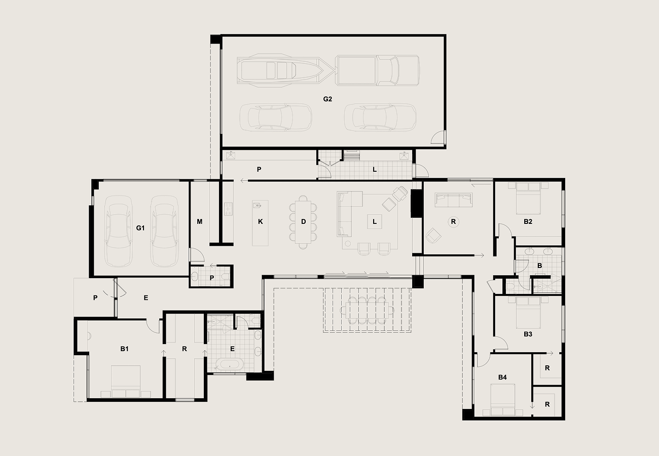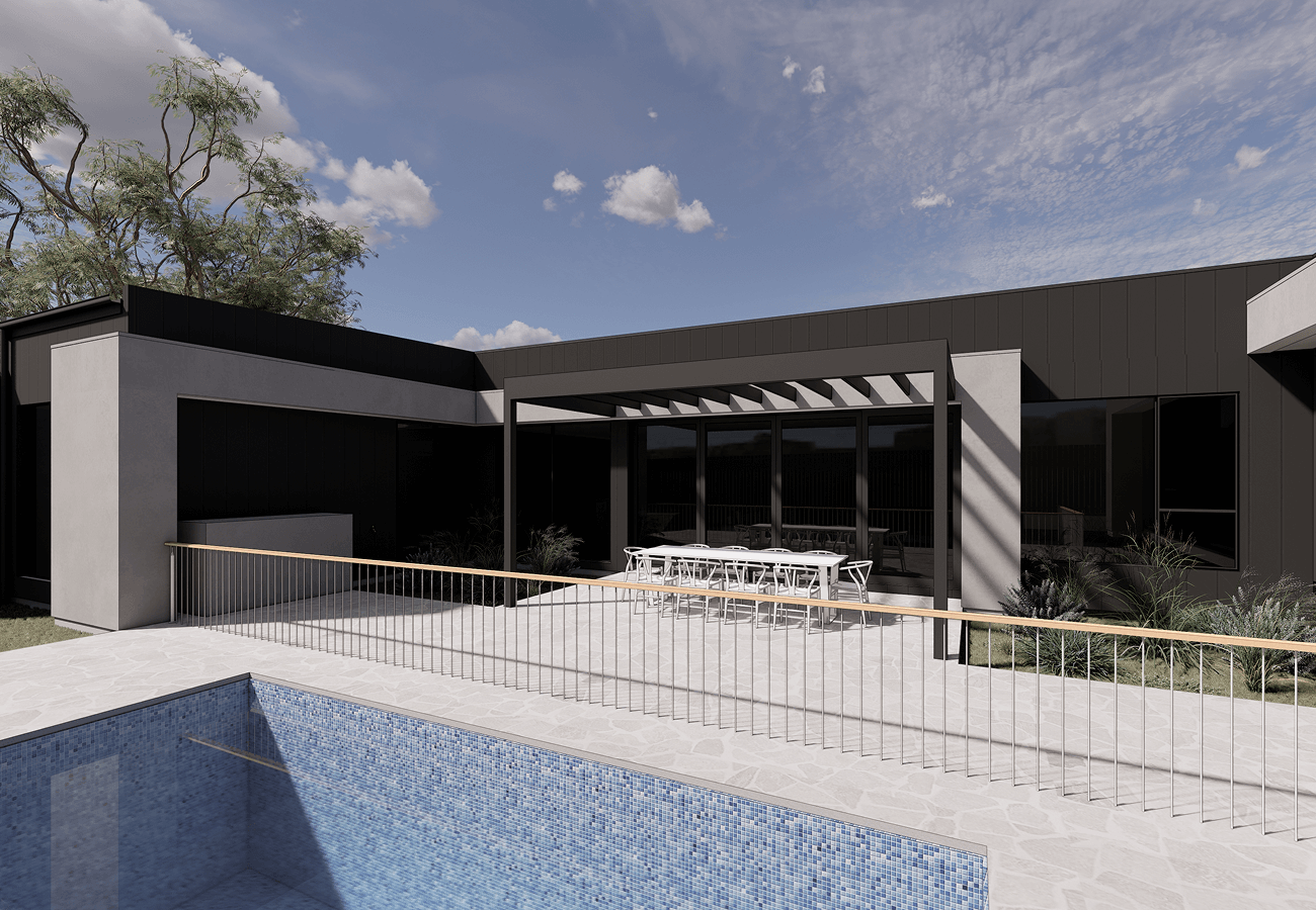 The plan is anchored by two distinct wings: the master suite and a children’s wing comprising two bedrooms, a guest room and an activity space. Dual living zones extend to the courtyard, encouraging connection while maintaining flexibility for family life. An oversized secondary garage further enhances functionality, with every element thoughtfully resolved to reflect the client’s needs.